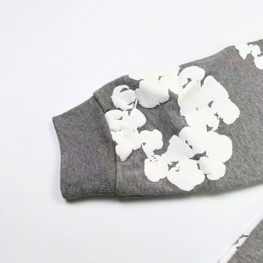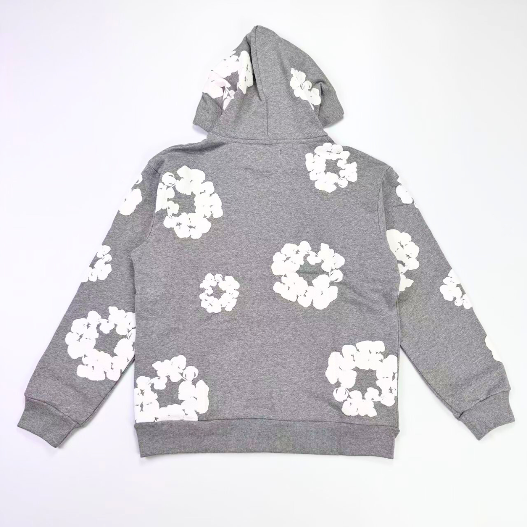 The Grey Denim Tear White Flower Hoodie features a unique grey denim tear design, providing both texture and visual interest. This hoodie combines comfort with style, making it suitable for various casual settings. Its durable construction contributes to long-lasting wear, ensuring it remains a staple in your wardrobe.